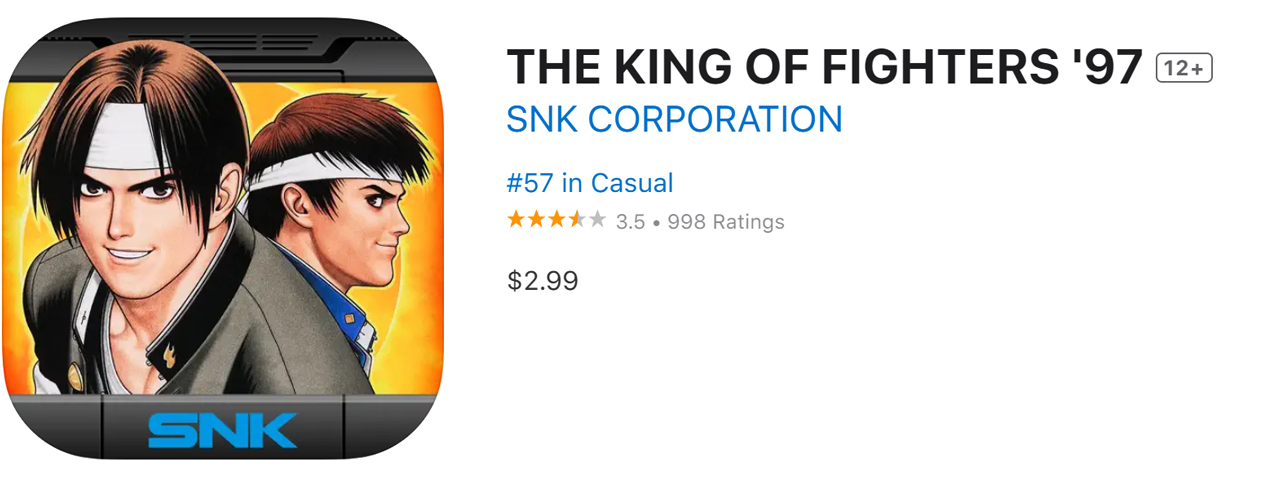 《拳皇97 THE KING OF FIGHTERS '97》(日语:ザ・キング・オブ・ファイターズ'97)是由日本SNK公司于1997年发行的一款街机格斗游戏,为《拳皇96》的续作,其后续作品为《拳皇98》。 该作相比拳皇系列前三个版本在各方面均有较大改进,是拳皇系列的成熟之作。