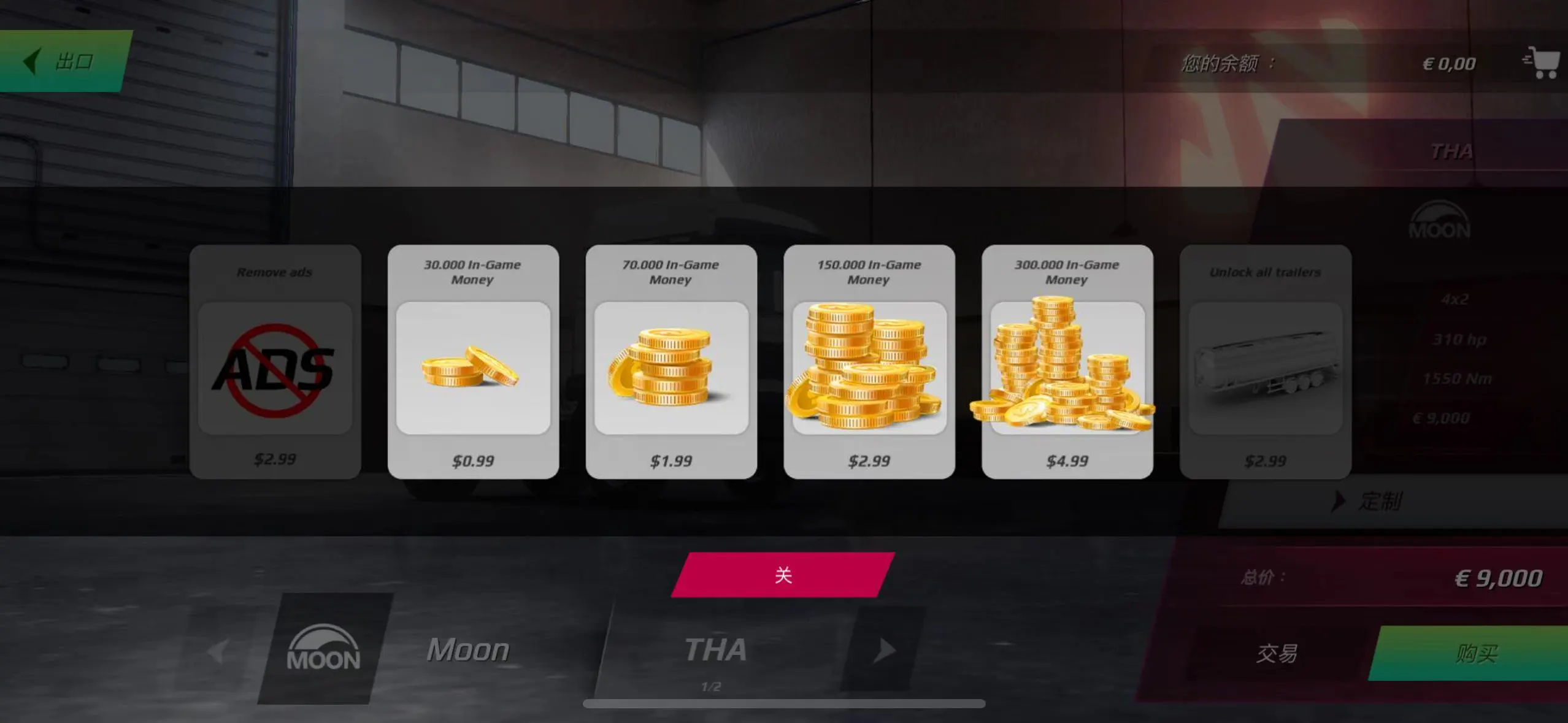 已解锁该游戏“拖车包、去除广告”内购,但不包含金币,自行赚取金币购买卡车、拖车即可